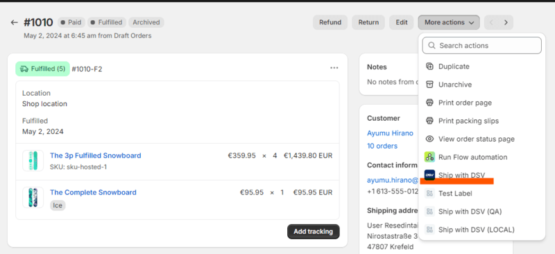 2. After navigating to the order page, click on “More actions” on the right top corner and then click on “Ship with DSV”.