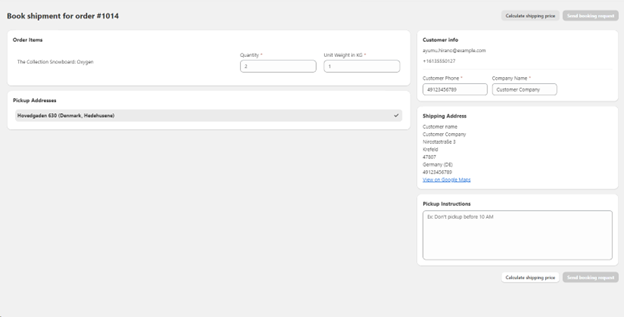 3. You will be directed to a new page where you can finalize the details for booking the to DSV (e.g. the item quantity, weight, customer phone number, and company name)