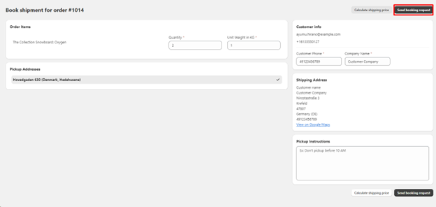 5. After selecting the shipping method, click on the “Send booking request” button to send and confirm the Package with DSV.